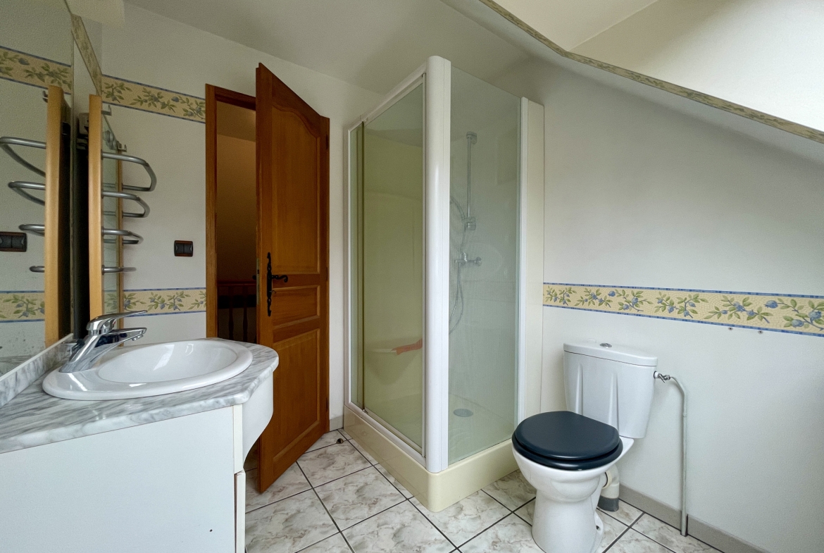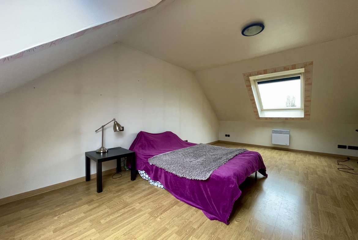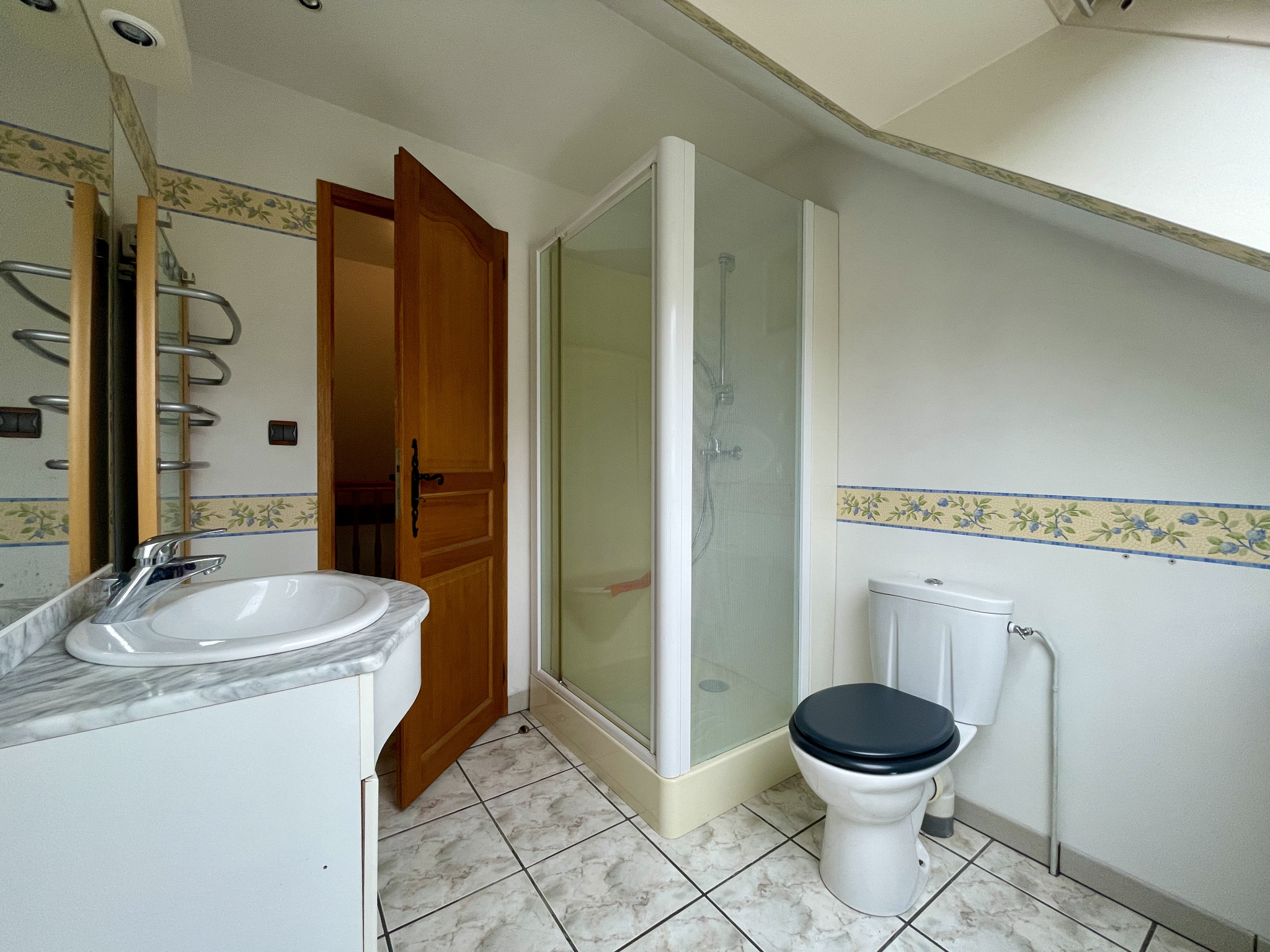 À l’étage, vous y trouverez un palier desservant 1 grande chambre de 17m2, une salle de douches avec WC et un grenier avec beau potentiel d’aménagement !