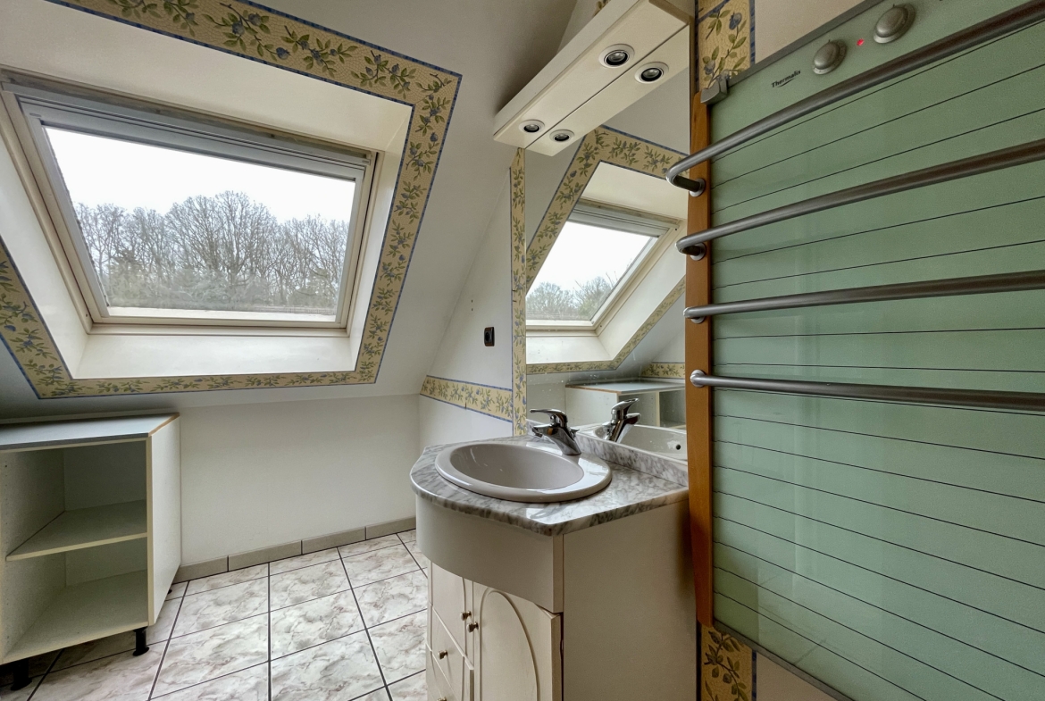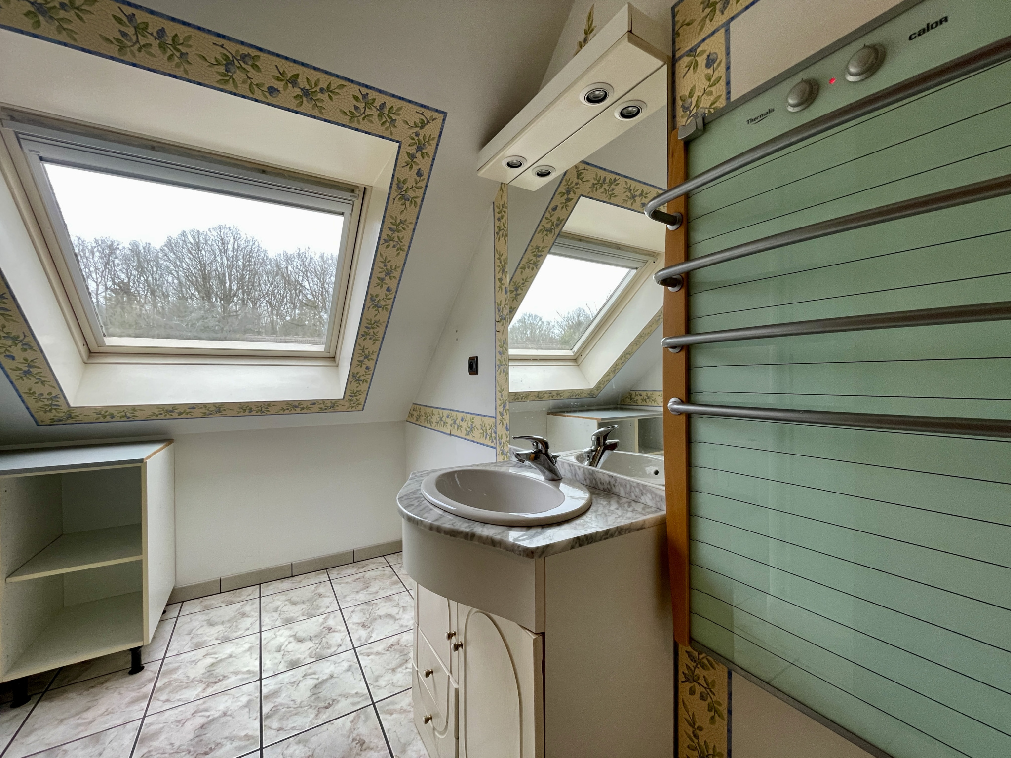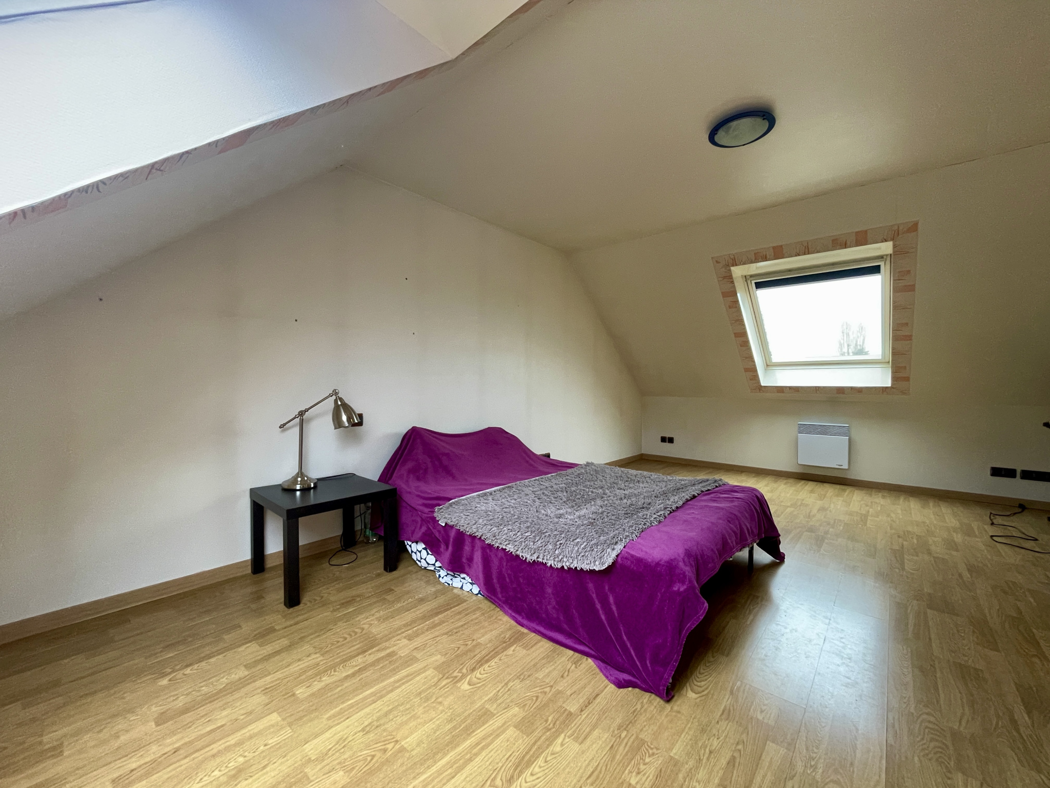 À l’étage, vous y trouverez un palier desservant 1 grande chambre de 17m2, une salle de douches avec WC et un grenier avec beau potentiel d’aménagement !