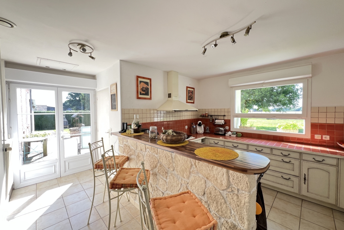 Au rez-de-chaussée, vous touverez une belle pièce de vie d’environ 60 m2, lumineuse et conviviale, idéale pour recevoir. Une cuisine indépendante, aménagée et équipée, complète cet espace. Se trouve également à ce niveau, quatres chambres, une salle d’eau et des rangements, permettant une vie de plain-pied très confortable.