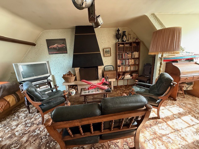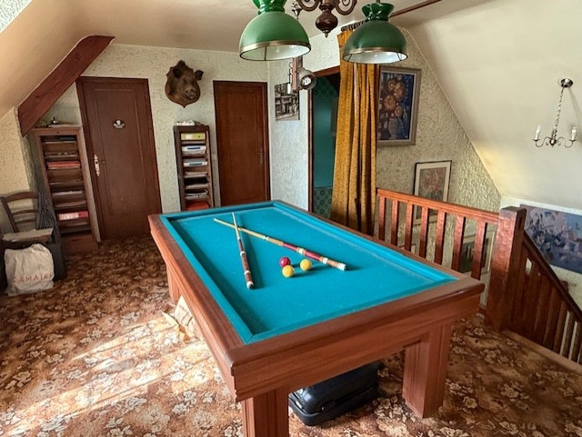 A l’étage, un spacieux pallier de 30m2 servant de pièce loisir équipée d’une cheminée, deux chambres, une salle de bains.