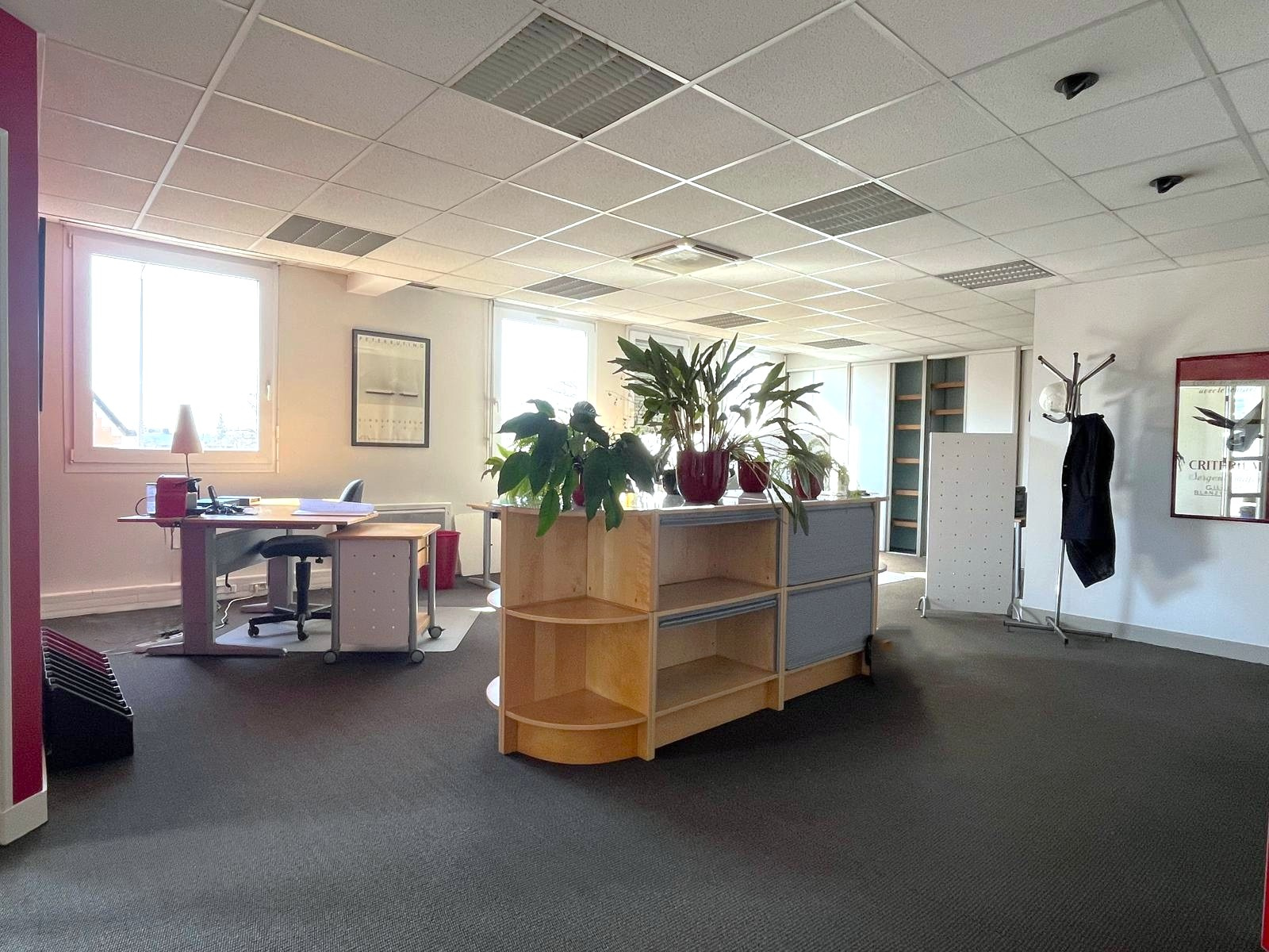 L’espace se compose actuellement d’un vaste open space de 64 m2, d’un bureau fermé de 17 m2, d’un grand placard de rangement et d’un WC.